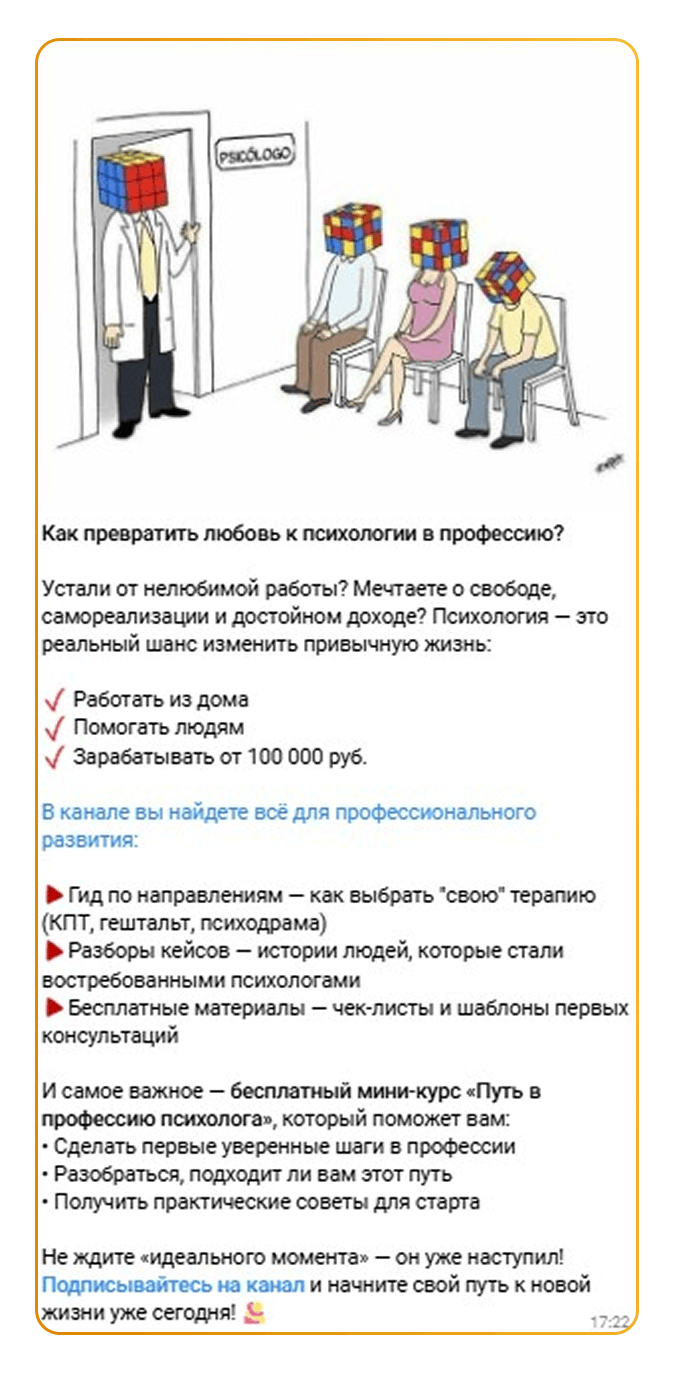 - Каналы с полезным контентом по психологии — там собраны люди, которые регулярно интересуются темой, читают разборы, изучают методики. Мы рассчитывали, что такие подписчики будут открыты к углублённому обучению.