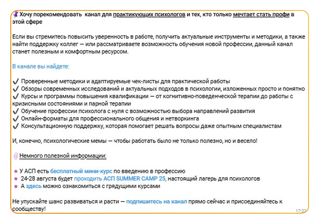 - Каналы конкурентов, где публикуются курсы, стажировки и программы для психологов. Выбор был очевиден: аудитория таких каналов уже ищет обучение, сравнивает варианты и готова к инвестированию в профессиональный рост. Это осознанная аудитория с высоким потенциалом конверсии.