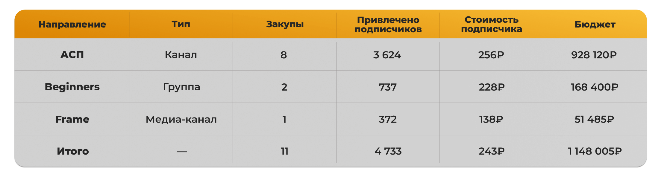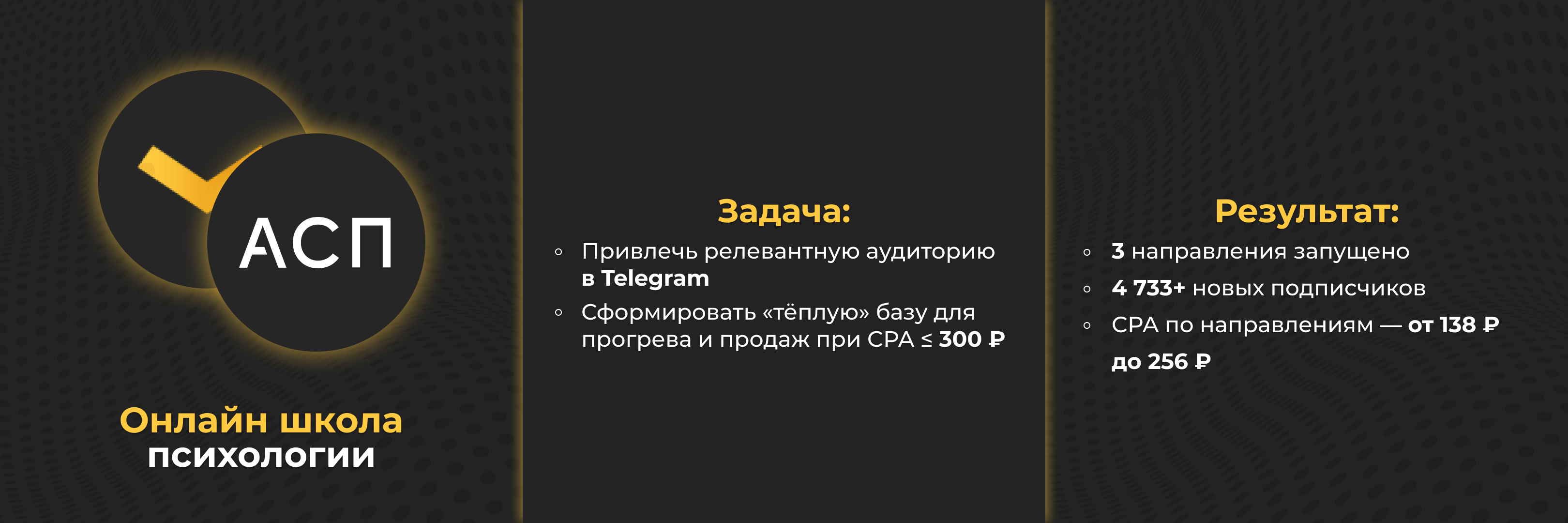 в кейсе «Продвижение онлайн-курсов по психологии во ВКонтакте, Яндекс. Директе, Telegram Ads и Telegram-посевах — 9,4 млн рублей выручки за 10 месяцев»
