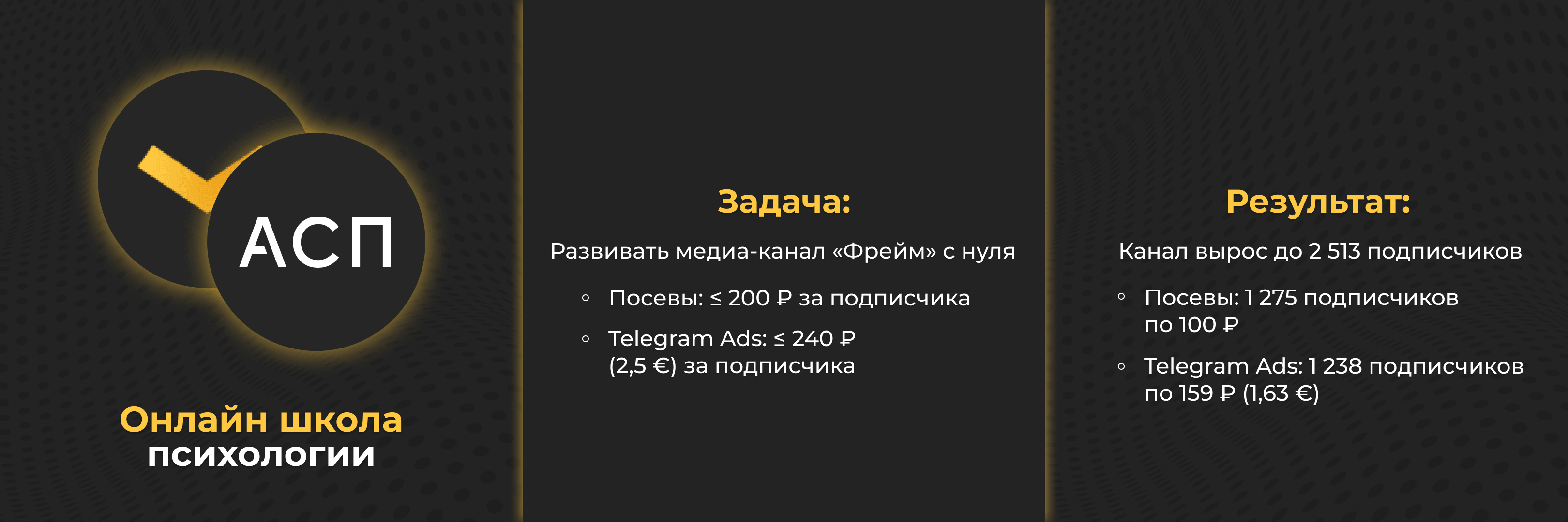 С онлайн-школой современной психологии АСП мы работаем 18 месяцев: ведем таргетированную рекламу ВКонтакте, Яндекс. Директ и продвижение в Telegram. В октябре 2025 года клиент пришёл с задачей: развить новый медиа-канал Фрейм, повысить его узнаваемость и сформировать лояльную аудиторию вокруг экспертного контента по современной психологии. Продаж через канал не планировалось — фокус был именно на медиа: охваты, вовлечённость, статус эксперта в нише.