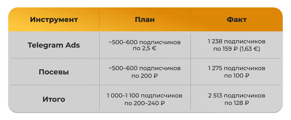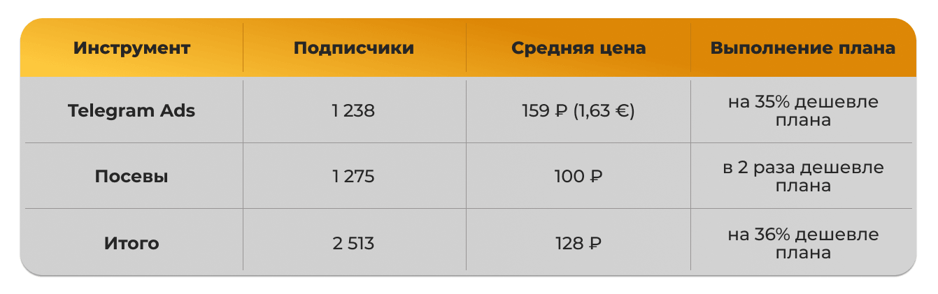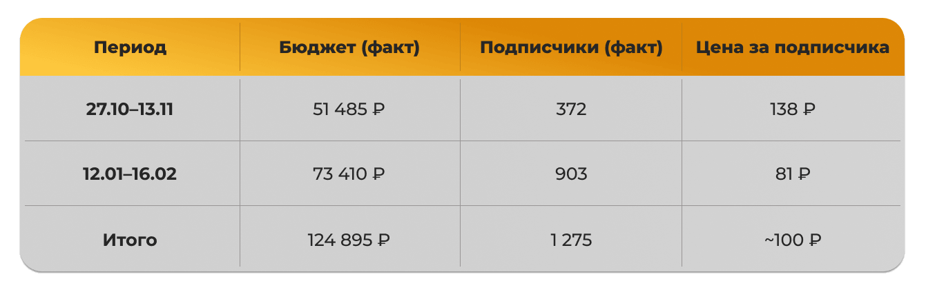 В результате за 5 месяцев привлекли 2 513 подписчиков по средней цене 128 ₽, что на 36% дешевле плана.