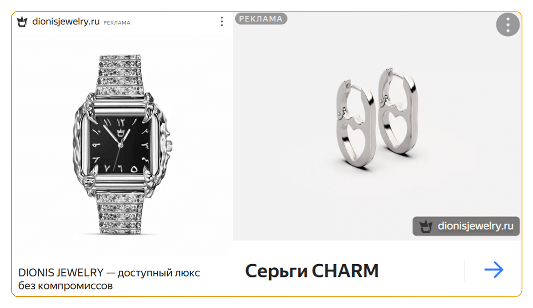 Поскольку основной фактор покупки ЦА — это уникальный дизайн, мы решили не отвлекать от него. В рекламе использовали чистые фото изделий на белом фоне — без моделей, без «атмосферы». Просто показали украшение «как есть». И это сработало: когда человек видит товар «лицом», он сразу понимает — цепляет или нет. Если да — переходит и покупает. Без долгих размышлений.