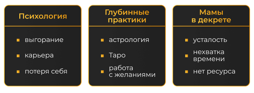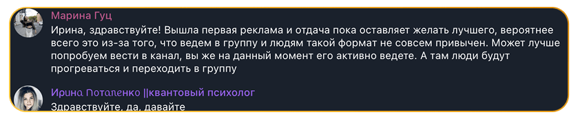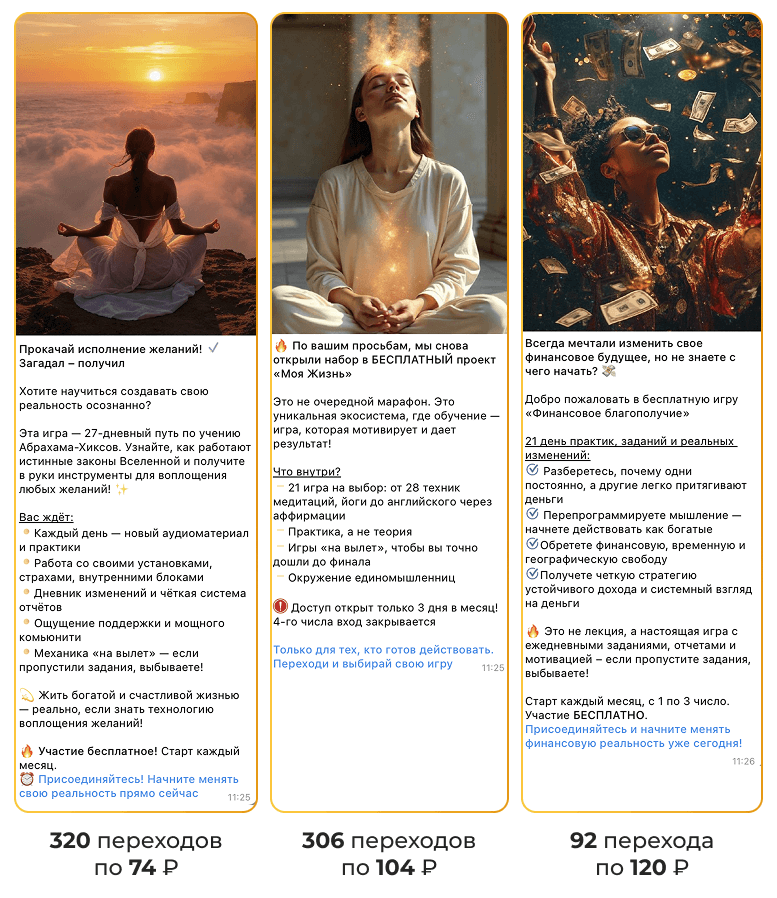 Из 15 рекламных постов оставили только 7 самых сильных: тексты про «духовность» не цепляли, а лучше работали практичные сообщения про изменение мышления и исполнение желаний. Ниши «психология» и "глубинные практики" (таро, гороскопы, работа с мышлением) показали сопоставимые результаты — обе оставили для основного закупа.