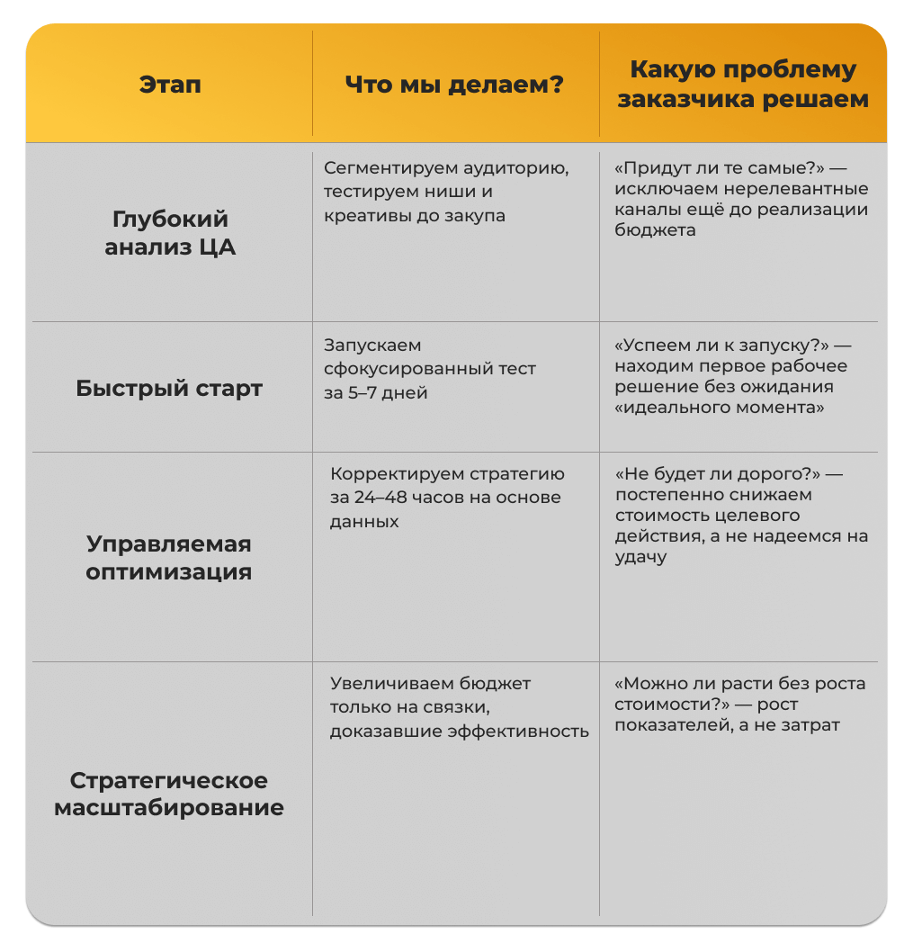 Тестирование не было тратой времени и денег. Оно помогло отсечь нерелевантную аудиторию, отобрать рабочие креативы и найти ту нишу, где целевая аудитория откликается охотнее и дешевле — даже если это противоречит первоначальной интуиции.